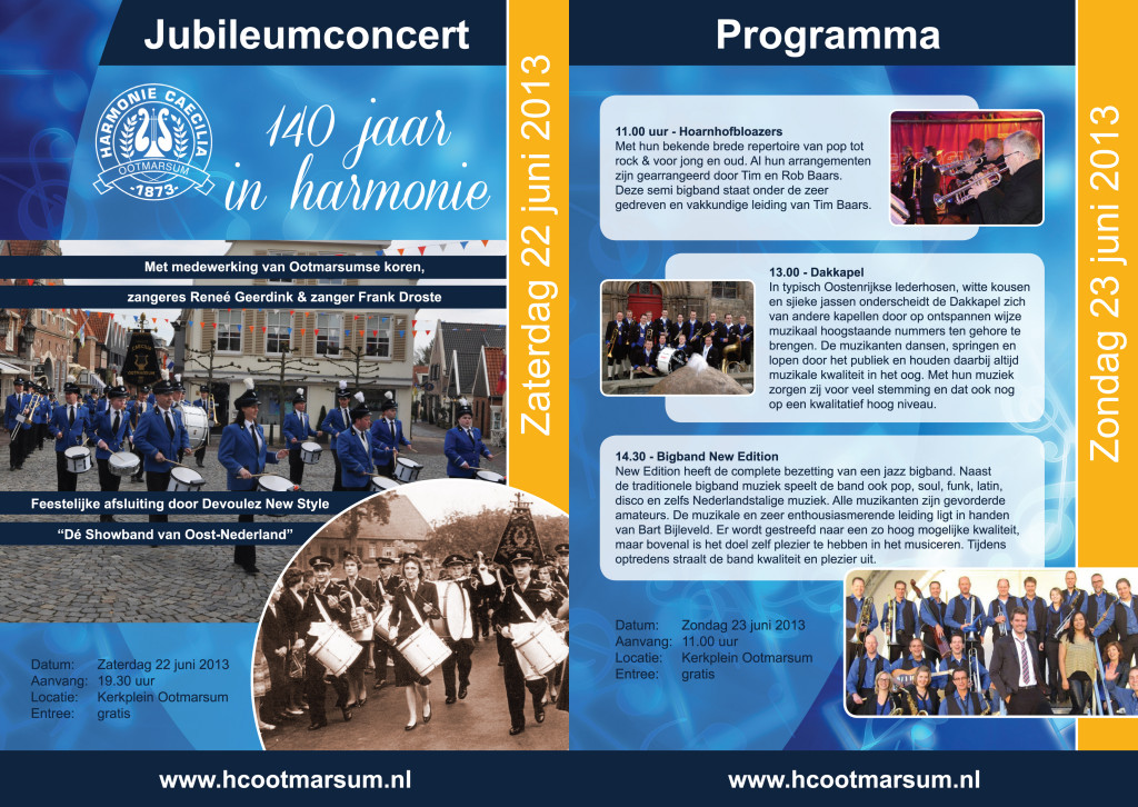 Harmonie Caecilia bestaat 140 jaar. Dat jubileum wordt groots gevierd op zaterdag 22 en zondag 23 juni. Het muziekkorps fungeert al jaren in volledige harmonie met de plaatselijke bevolking en mag gerust het muzikale bindmiddel worden genoemd in de Ootmarsumse gemeenschap. Showconcerten, kerstconcerten, aubades, betrokken bij openingen en jubilea, Koninginnedag, Sinterklaas, 4 mei herdenking en het medewerking verlenen aan tal van concerten van koren, kerkdiensten en zo zijn er vast nog wel meerdere activiteiten op te noemen. De harmonie heeft een centrale, muzikale plek in Ootmarsum en daarom viert het muziekkorps dit jubileumjaar ook in het centrum van het stadje. Op het Kerkplein is er zaterdagavond een concert van de harmonie. Daarnaast is er de medewerking van diverse koren en zullen ook zangeres Renée Geerdink en zanger Frank Droste hun bijdrage leveren aan dit unieke jubileumconcert. Deze avond, die om 19.30 uur begint, wordt afgesloten met ‘Devoulez New Style’ de show band van Oost-Nederland.